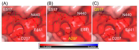 Representation of surface and charge distribution within the active site of ArthβDG (A) and its mutants: ArthβDG_D207A (B) and ArthβDG_E517Q (C). The residues under scrutiny are shown as stick and mutations are indicated with yellow. The charge distribution was calculated using the APBS [] plugin to PyMOL.