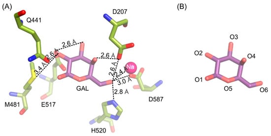 Interactions stabilizing galactose molecule in the active site of ArthβDG_E441Q/gal complex structure (A). Naming convention of galactose’s oxygen atoms presented for easier interpretation (B).