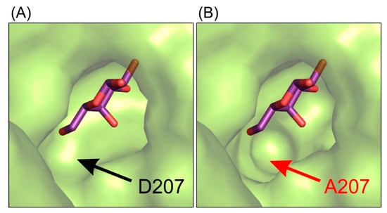 In the case of mutant ArthβDG_D207A, where a larger side chain was substituted with alanine residue, the change in active site size and shape was introduced (Figure 1B).