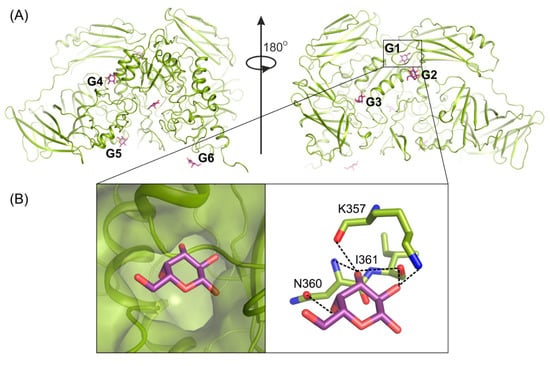 Galactose (violet) binding sites G1–G6 on the surface of ArthβDG (A); structure of ArthβDG_E441Q in complex with galactose (B). The galactose molecule (violet) interacting with main chain atoms at G1 site; galactose hydroxyl group O2 interacts with oxygen K357 (2.8 Å), oxygen I361 (2.9 Å); O3 with oxygen I361 (3.4 Å), nitrogen N360 (3.5 Å) and oxygen K357 (2.7 Å); O4 with N360 (2.8 Å).