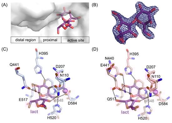 Crystal structures of loss of function ArthβDG_E441Q and ArthβDG_E517Q mutants in complexes with lactulose were determined both at 2.0 Å resolution. Lactulose molecule, a heterooligosaccharide composed of d-galactose and d-fructose linked through a β-(1→4)-glycosidic bond and is one of the products of transglycosylation reaction catalyzed by ArthβDG. It was bound in a deep mode in both structures (Figure 5A). The galactosyl moiety is stabilized by a net of interaction characteristic for binding of this group by ArthβDG, and described in detail in Section 2.4.