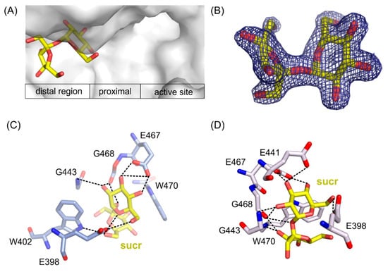 Two structures of the mutants’ complexes with sucrose, a common sugar composed of d-galoctose and d-fructose linked through a β-(1→2)-glycosidic bond, were determined with resolution 1.7 Å for ArthβDG_E441Q/suc and 2.2 Å for ArthβDG_D207A/sucr. In both cases, sucrose was bound in the same place outside of the active site of enzyme, revealing a glucopyranose binding site in its distal region (Figure 6A).