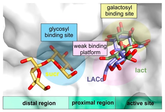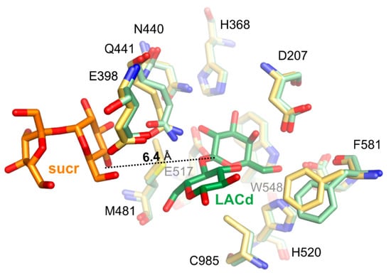 Superposition of ArthβDG_E441Q/sucr with complex structure of the same mutant with lactose bound in deep mode, ArthβDG_E441Q/LACd (PDB ID: 6SEA []) shows that the distance between anomeric carbon atom of galactosyl moiety bound in deep mode and hydroxyl group O4 of sucrose was 6.4 Å (Figure 7). This insight into sucrose binding in the distal region of active site shows how the glycosyl moiety is positioned in the vicinity of the active site, so it can become galactosyl group acceptor.