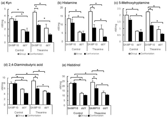 Metabolite levels in the hippocampus of SAMP10 and ddY mice; (a) Kyn, (b) histamine, (c) 5-methoxytryptamine, (d) 2,4-diaminobutyric acid, (e) histidinol, (f) GMP, (g) carnosine, (h) Put, (i) Orn, and (j) adenosine. Mice were housed confrontationally for one month after single housing for one month (closed column). Group-housed mice were kept in a group of six for two months (open column). Mice ingested theanine (20 µg/mL, 6 mg/kg) or water (control) for two months (n = 3–4, *, p < 0.05).