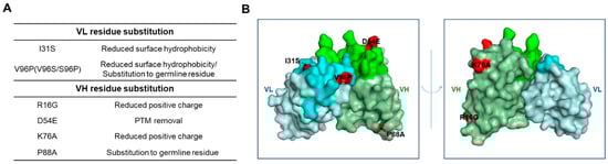 Schematic representation of the substitutions of Ab417 for improved biophysical properties. (A) Design of the VL and VH residue substitutions. (B) The 3D model of Ab417. The I31S and V96P in the VL and the R16G, D54E, K76A, and P88A in the VH are shown in red. Gray, VL; Green, VH; Lime, LCDR; Light green, HCDR.