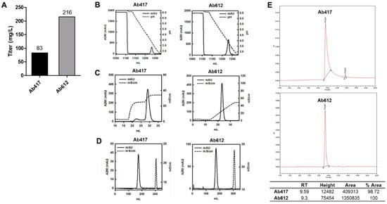 (A) Expression levels of antibodies using the ExpiCHO transient expression system. (B,C) Ab417 and Ab612 were purified by protein A affinity chromatography (B) and CIEX by stepwise gradient elution and linear gradient elution, respectively (C). (D) Final polishing was conducted using SEC. (E) SEC-HPLC of each antibody was performed to determine the purity and homogeneity following purification.