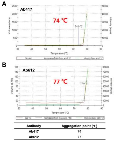 To assess the thermal stability of Ab417 and Ab612, the purified antibodies were evaluated by dynamic light scattering (DLS) while increasing the temperature from 30 °C to 80 °C. The aggregation starting point was 74 °C for Ab417 and 77 °C for Ab612 (Figure 3), indicating that Ab612 exhibited increased thermal stability compared to Ab417. Taken together with the analyses of expression and purification processing, these results demonstrate that compared to Ab417, Ab612 showed improved biophysical properties, including increased productivity, reduced aggregation propensity and fragmentation, and increased thermal stability.