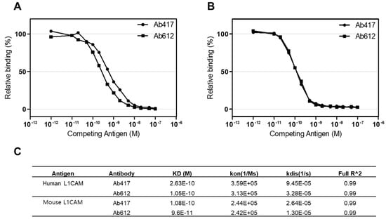 A competitive ELISA was performed to determine the antigen-binding affinity of the antibody. hL1-s1 or mL1-s1 (100 ng/well) were coated on each well at 4 °C for 12 h. Ab417 or Ab612 antibody (10 ng/mL) in 0.1% PBA solution was pre-incubated with various concentrations (10−12~10−7 M) of hL1-s1 or mL1-s1 as a competing antigen at 37 °C for 3 h. The reaction mixture was added to each well coated with the hL1-s1 or mL1-s1, and indirect ELISA was carried out. Affinity (KD) was defined as the antigen concentration required to inhibit 50% of the antigen-binding activity.