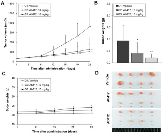 Anti-tumor efficacy of Ab612 compared with Ab417 in a Choi-Ck cholangiocarcinoma xenograft nude mouse model (n = 8). When the tumor volume reached an average of 100 mm3, dosing (10 mpk) was initiated 3 times weekly for 22 days. Mean tumor volume (A), tumor weight (B), and body weight (C) are shown. (D) Photographs of the resected tumors at the end of the experiment. Each point represents the mean ± SD. * p < 0.05, ** p < 0.01, significant difference from the isotype control group by Dunnett’s t-test.