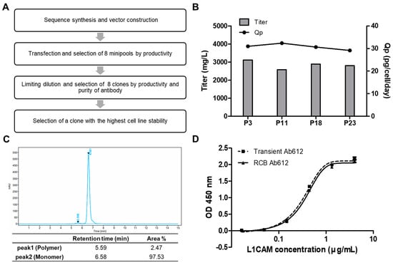 (A) Schematic diagram showing the generation of a research cell bank (RCB). (B) Ab612 titer was measured to assess the expression level, and Qp was calculated as PCD = (pg/cell/day) using PA-HPLC. (C) The purity of Ab612 produced from the RCB was analyzed by SEC-HPLC after purification. (D) Ag binding activity was determined by sandwich ELISA.