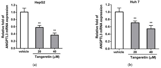 RNA extraction and RT-Q-PCR analysis were performed as previously described [74]. Briefly, cells were treated with vehicle or tangeretin (20 and 40 μM) for 24 h, and cellular RNA was extracted using a FavorPrepTM blood/cultured cell total RNA purification mini kit (FAVORGEN Biotech, Ping-Tung, Taiwan) according to the manufacturer’s instructions. cDNA was synthesized with a High-Capacity cDNA Reverse Transcription Kit (Thermo Fisher Scientific, Rockford, IL, USA). Quantitative real-time PCR was performed in mixtures containing cDNA, human-specific primers (ANGPTL3, 5′-TCCTGCTGAATGTACCACCA-3′ (forward), and 5′-TCTTCTCTAGGCCCAACCAA -3′ (reverse); GAPDH, 5′-ATGAGAAGTATGACAACAGCCT-3′ (forward), and 5′-AGTCCTTCCACGATACCAAAGT-3′ (reverse)) and Maxima SYBR Green/ROX qPCR Master Mix (Thermo Fisher Scientific, Rockford, IL, USA) reagents. PCR amplification was completed in a Roche LightCycler® 480 Real-Time PCR System (Roche Diagnostics GmbH, Mannheim, Germany) according to the manufacturer’s instructions. The ΔΔCt method was used to calculate the relative differences in mRNA expression. The experimental mRNA levels were normalized to the expression of control GAPDH mRNA in the same samples.