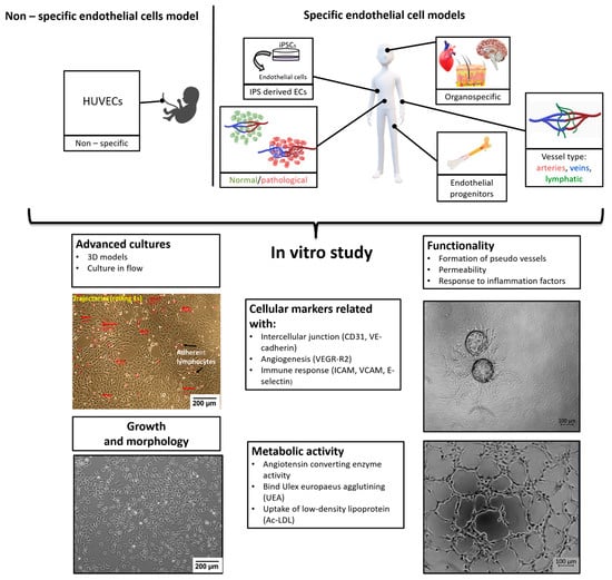 Due to the widespread occurrence of the vascular system in the body—endothelial cells are pervasive and occur in all parts of the organism—the weight of endothelium in an adult human is about 720 g []. However, endothelium is not a set of identical cells, but it is an extremely phenotypically diverse system (Figure 1). Another feature is structural, ECs differ according to their origin i.e., whether they are from microvessels (FSkMEC), macrovessels (FUmEC) (Patent number: 9228173) or lymphatics vessels (SVHEC SV40 immortalized murine endothelium cells line from peripheral lymph-node high endothelium) [,]. Moreover, activity of ECs varies in pathological states as compared to physiological ones (healthy breast-derived ECs and breast tumor-derived ECs). Differences are visible at the level of gene expression, surface antigens, cell morphology and properties linked to the biological state of the organ they are in. In this summary, we present various endothelial cell models used in in vitro studies, taking into account distinct states of cell differentiation, organo-specificity, origin and functions, what will be valuable for the selection of proper, relevant to in vivo conditions, research model. The selection of ECs as models for in vitro studies requires detailed characteristics.