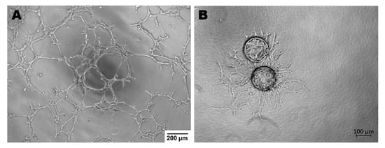 Endothelial cells ability to angiogenesis in vitro. (A)—Tube Formation Assay, magnification 4×; (B)—Sprouting Assay based on Cytodex beads, magnification 5×; both assays were performed with murine brain derived endothelial cells (MBr MEC FVB).