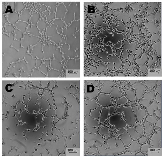 The effect of microenvironment and organospecificity on the angiogenic potential of Endothelial cells (ECs). Morphology of tubes formed in vitro by healthy and cancer-derived EC cells after 5 h in normoxia or hypoxia. Low pO2 reduces the pro-angiogenic response in ECs derived from tumor site when compared to normoxia. In the case of healthy tissue-derived ECs, hypoxia does not significantly influence tube formation. (A)—healthy ECs, normoxia; (B)—healthy ECs, hypoxia; (C)—cancer-derived ECs, normoxia; (D)—cancer-derived ECs, hypoxia; magnification 5×.