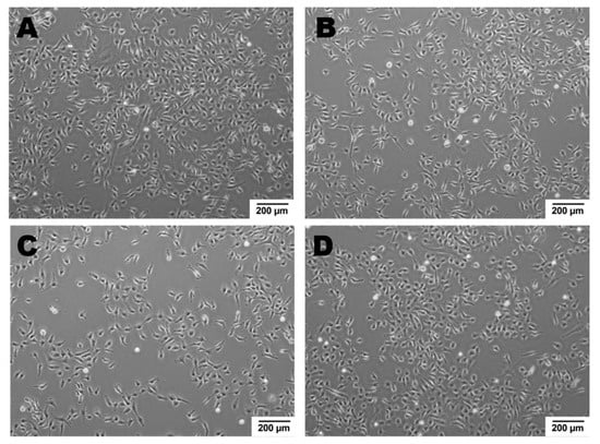 ECs’ growth modulated by hypoxic micro-environmental conditions. Cell density after 48 h in normoxia or hypoxia: Cells were seeded at 0 h in the same number. Growth of healthy ECs is a little slower upon hypoxia vs. normoxia, oppositely to cancer derived ECs, whose growth is higher in hypoxic conditions as compared to normoxia. (A)—healthy ECs, normoxia; (B)—healthy ECs, hypoxia; (C)—cancer-derived ECs, normoxia; (D)—cancer-derived ECs, hypoxia; magnification 4×.
