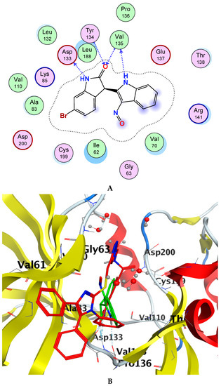 Glycogen synthase kinase-3 beta (GSK-3β) is a promising target with an overexpressed oncogene in different breast cancers [49], so we evaluated the binding modes of our potent compound 4k as a selective MCF-7 cytotoxic agent against the GSK-3β ATP binding pocket and confirmed the overall prognostic dependency of breast cancer patients on the GSK-3β inhibition effect. We docked the 4k test ligand on our target protein, i.e., GSK-3β (PDB ID: 1UV5), in order to analyze the binding pattern and affinity using the software MOE. Docking poses of the bound and tested compound 4k are depicted in Figure 3A–C. The compound 4k displayed an excellent binding interaction and affinity, i.e., −9.8 kcal/mol toward GSK-3β target compared to the reference drug; 6-Bromoindirubin-3′-oxime with −8.8 kcal/mol. The interaction analysis of the bound ligand; 6-bromoindirubin-3′-oxime, exhibited that the cyclic nitrogen of the pyrrole ring donates a hydrogen bond to the peptide carbonyl oxygen of Val135, while the cyclic nitrogen of the lactam ring donates a hydrogen bond to the carbonyl oxygen of Asp133, and the lactam carbonyl oxygen accepts a hydrogen bond from the backbone amide of Val135 and Tyr134. The molecular docking studies revealed that the compound 4k emerged to be a promising drug candidate; on the account of its lowest binding energy, i.e., −9.8 kcal/mol with the active site residues of the target receptor GSK-3β and this might be one of the reasons for its good in vitro anticancer activity. The putative interaction of compound 4k with GSK3 suggested that the terminal aromatic ring might display two hydrogen bond interactions through the COOH substituent with the backbone carbonyl group of Asp133 and the backbone amide of Val135, respectively. Moreover, another essential linker hydrogen bond through the carbonyl of amide with conserved Cys199 stabilized the compound in the pocket. In addition, the fit of the aromatic systems for the whole compound occurs through a group of aromatic stacking interactions with corresponding residues; Ile62, Tyr134, Asn64 for triazole ring, Val70, and Leu188 that might support selective binding. The 2D and 3D analysis of the target compound 4k mapped to the 6-Bromoindirubin-3′-oxime as a reference is shown in Figure 3. Taken together, these observations might rationalize the observed cytotoxic activity of 4k through the inhibitory effect of overexpressed GSK-3β within the cancer cell lines.