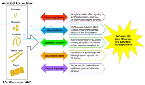 Furthermore, while retinal Aβ has been shown to contribute to increased neuronal loss in line with these pathologies, treatment approaches directly targeting Aβ accumulation systematically and locally has largely been not effective at mitigating disease progression and achieving the primary objective of preserving cognition and vision in various stages of disease severity. This may indicate that either not enough Aβ deposits had been removed to produce a measurable clinical effect or Aβ accumulations had already initiated pathological cascades that have led to progressive neurodegeneration. Thus, Aβ-based treatment for AD, glaucoma, and AMD still requires further development and exploration before it may be beneficial for clinical application. One possible direction for new treatment approaches may involve directly targeting the pathological mechanisms that are associated with retinal Aβ accumulation. Among the many Aβ-associated pathological mechanisms, the pathophysiology of AD, glaucoma, and AMD appear to be affected by Aβ-induced inflammatory pathways, oxidative stress, cytoskeletal disruption, synaptic remodeling, and vascular alterations. Understanding of the mechanisms behind these shared pathological effects has yielded several potential therapeutic targets that may provide possible treatment targets for these neurodegenerative diseases. Future studies based on the pathway components may lead to therapeutic measures that can ameliorate the pathological effects of these neurodegenerative diseases and protect against loss of cognition and vision. Ultimately, for AD, glaucoma, and AMD, Aβ accumulation in the retina with its associated pathological cascades may hold the key for further understanding the pathophysiology of complex neurodegeneration-associated diseases, which can potentially lead to novel treatments and clinical applications.