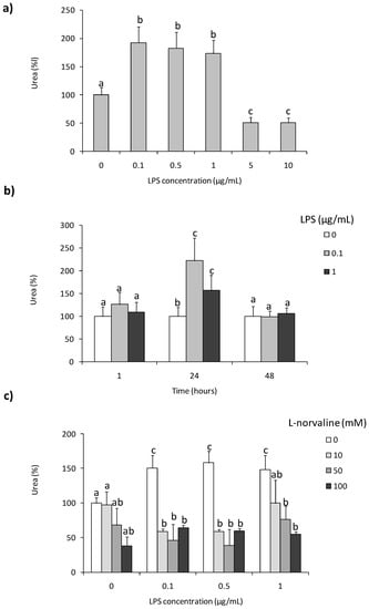 Effects of in vitro stimulation with lipopolysaccharide on arginase activity in Eisenia andrei coelomocytes. Cells were in vitro treated with lipopolysaccharide (LPS) (0–10 µg/mL) for 24 h (a) or with LPS (0–1 µg/mL) for 1, 24, or 48 h (b). Some cells 1 h before stimulation were treated with arginase activity inhibitor (l-norvaline, 10–100 mM) (c). Arginase activity was determined as urea content and showed as % of control (arginase activity in unstimulated cells = 100%). Mean + standard errors (SE), n = 8–16. Mean values that are significantly different are not assigned a common letter (e.g., a vs. b or b vs. c) according to one-way analysis of variance (ANOVA) (at p < 0.05).