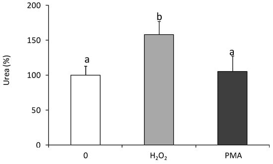 Effects of in vitro stimulation with hydrogen peroxide or phorbol ester on arginase activity in Eisenia andrei coelomocytes. Cells were in vitro treated for 24 h with H2O2 (50 µM), phorbol 12-myristate 13-acetate, PMA (0.1 µg), or with culture medium (0). Arginase activity was determined as urea content and showed as % of control (arginase activity in unstimulated cells = 100%). Mean + SE, n = 6–9. Mean values that are significantly different are not assigned a common letter (e.g., a vs. b or b vs. c) according to one-way analysis of variance (ANOVA) (at p < 0.05).