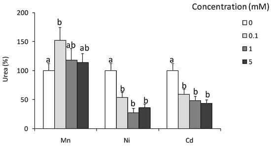 Mn2+ ions in concentration 0.1 mM increased the arginase activity by 40–50%, while Ni2+ and Cd2+ in all tested concentrations down-regulated arginase activity (Figure 3).