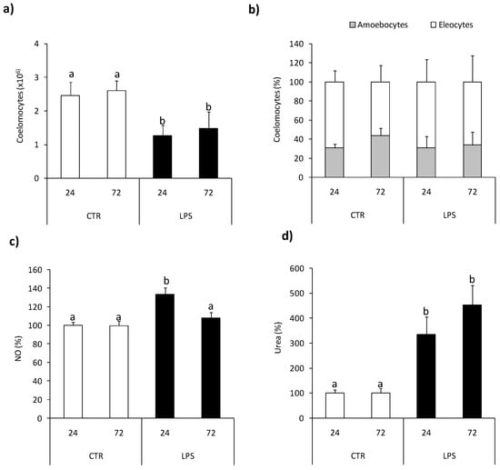 Effects of in vivo stimulation with lipopolysaccharide on arginase activity and nitric oxide production in Eisenia andrei coelomocytes. Coelomocytes were collected 24 or 72 h post earthworms injection with 0.9% sodium chloride (CTR) or with LPS (1 mg/mL). Number (a) and composition (b) of coelomocytes was counted. Nitric oxide (NO) production (c) and arginase activity (d) are showed as % of control (NO production and arginase activity in coelomocytes of CTR animals = 100%). Mean + SE, n = 8. Mean values that are significantly different are not assigned a common letter (e.g., a vs. b or b vs. c) according to one-way analysis of variance (ANOVA) (at p < 0.05).