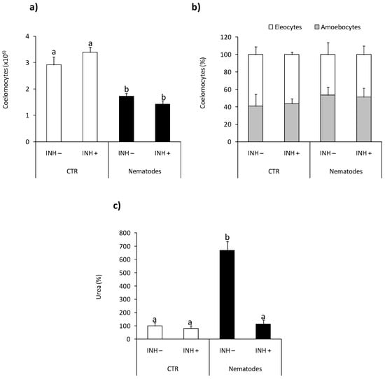 Effects of in vivo nematode infection on arginase activity in Eisenia andrei coelomocytes. Coelomocytes were collected 24 h post earthworms injection with 0.9% sodium chloride (CTR) or with nematodes (S. feltiae, 1000–1500 nematodes/mL). Prior to stimulation, some earthworms were injected for 1 h with arginase inhibitor l-norvaline (100 mM, INH+) or sodium chloride (INH–). The number (a) and composition (b) of coelomocytes were counted. Arginase activity was determined as urea content and showed as % of control (arginase activity in coelomocytes of CTR animals = 100%) (c). Mean values that are significantly different are not assigned a common letter (e.g., a vs. b or b vs. c) according to one-way analysis of variance (ANOVA) (at p < 0.05).
