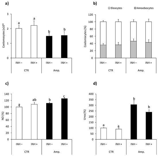 Effects of segment amputation on arginase activity and nitric oxide production in Eisenia andrei coelomocytes. Coelomocytes were collected from control animals (CTR) or from animals 72 h post-amputation of 5 posterior segments (Amp.). Earthworms were injected for 1 h with arginase inhibitor l-norvaline (100 mM, INH+) or with 0.9%NaCl (INH–). The number (a) and composition (b) of coelomocytes were counted. Nitric oxide (NO) production (c) and arginase activity (d) are showed as % of control (NO production and arginase activity in coelomocytes of CTR animals = 100%). Mean values that are significantly different are not assigned a common letter (e.g., a vs. b or b vs. c) according to one-way analysis of variance (ANOVA) (at p < 0.05).