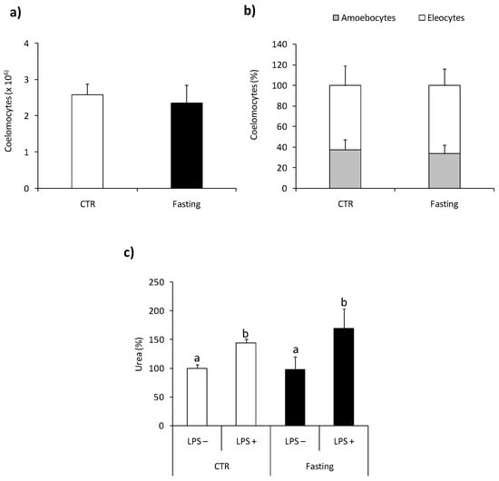 Effects of short-term fasting on arginaseactivity in Eisenia andrei coelomocytes. Coelomocytes were collected from earthworms kept in soil (CTR) or exposed for 5 days to filter paper soaked with distilled water (Fasting). The number (a) and composition (b) of coelomocytes were counted. Arginase activity (c) was measured in coelomocytes incubated for 24 h with control medium (LPS–) or with LPS (1 µg/mL, LPS+) and is shown as % of control (arginase activity in LPS-coelomocytes of CTR animals = 100%). Mean + SE, n = 10. Mean values that are significantly different are not assigned a common letter (e.g., a vs. b or b vs. c) according to one-way analysis of variance (ANOVA) (at p < 0.05).