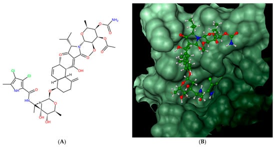 Kibdelomycin: structure (A), best pose in binding to S. aureus 43 kDa ParE (Protein Data Bank (PDB) entry: 4URL) (B), and interactions with amino acids in the active site (C).