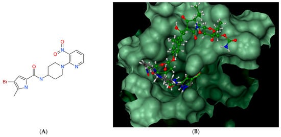 Compound 7, which was later found to be the most active against two strains of the Mycobacterium genus, was also studied for its binding potential in the ATPase region of Mycobacterium tuberculosis GyrB protein (PDB entry: 3ZM7), where it was predicted to bind with a higher affinity than predicted for the native inhibitor, AMPPCP (−27.1 vs. −23.0). As presented in Figure 6, it binds to the same site as AMPPCP and is stabilized by several hydrogen bonding interactions and close hydrophobic contacts with the surrounding amino acids. However, this observation was not confirmed later in the in vitro assay against the supercoiling activity of M. tuberculosis gyrase (data not shown).