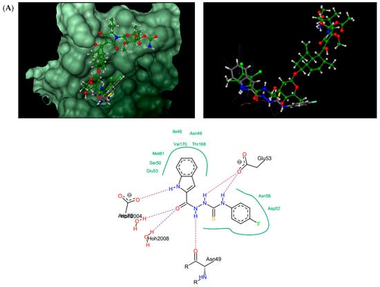 Other pyrrolamide and indolamide bacterial DNA topoisomerases inhibitors, such as the natural product clorobiocin [47] and synthetic compounds [36,48,49], have also been predicted by enzymatic assays or X-ray crystallography to act as ATPase inhibitors. Thus, it was reasonable to assume that our thiosemicarbazides with pyrrolamide (3 and 6) and indolamide (4, 7, 8) structural motifs will also bind to the ATP binding pocket. Therefore, prior to enzymatic studies, their proposed inhibitory mechanism was validated by computational docking.