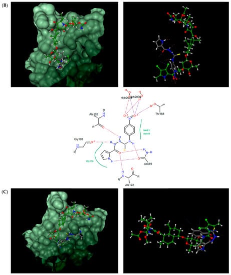 Flexible docking was performed by means of the FlexX algorithm [53] as implemented in the LeadIT software [54]. The energies of binding of thiosemicarbazides 1–8 into the ATP binding pocket of S. aureus 43 kDa ParE (PDB entry: 4URL) and GyrB (PDB entry: 4URM), for which 3D structures were taken from the crystal structures deposited in the Protein Data Bank [55], were analyzed. The active sites were defined to include all atoms within a 6.5 Å radius of the native ligands. The first 100 top-ranked docking poses were saved for each docking run.