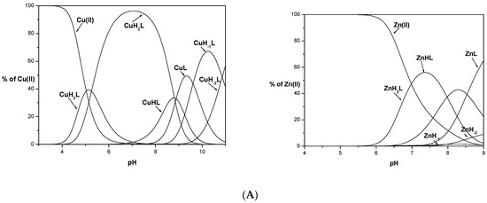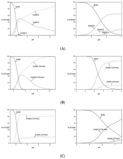 Potentiometric studies revealed that all studied ligands form equimolar complexes in the studied pH range (3–11). Distribution profiles for Cu(II) and Zn(II) complexes calculated based on titrations are depicted in Figure 1. Complexes of L1 with Zn(II) were precipitated in the experimental concentration used for potentiometry above pH 9, while for L2 and L3 complexes were insoluble above pH 7. For copper complexes, precipitation was not observed at any experimental pH value.