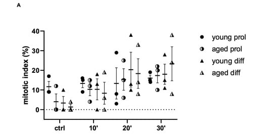 Indeed, the MI mean value significantly increases after 20 and 30 min of ViSS treatment compared to control conditions in both prol and diff aged cells, starting with percentages of a maximum of 5% to reach the 20–25% after the longest time of treatment (16.83 ± 3.11 aged prol 20 min vs. 5.08 ± 4.53 control, p = 0.0236; 18.67 ± 3.22 aged prol 30 min, p = 0.0024) (Figure 7A).