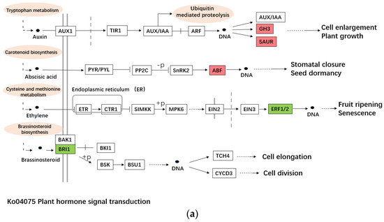 The pathways of DEGs’ participation. (a). The pathway of plant hormone signal transduction (ko04075). (b). The pathway of starch and sucrose metabolism (ko00500). (c). The pathway of DNA replication (ko03030).