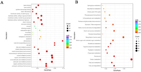 (A) GO enrichment of differentially expressed genes in Euryale ferox Salisb. (B) KEGG enrichment of differentially expressed genes in Euryale ferox Salisb.