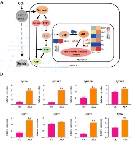 (A): Differentially expressed gene analysis of the starch biosynthesis pathway in response to ABA. (B): The relative expression levels of EfABI4 and starch biosynthesis-related genes after ABA treatment. The ‘**’ above the histogram indicated the statistical significance at the level of 0.01 (p < 0.01).