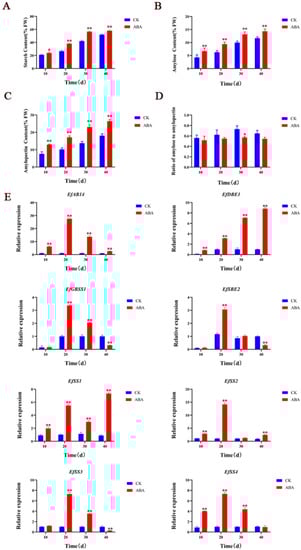 To further verify the transcriptome sequencing results, exogenous ABA was applied to the leaves of Euryale ferox during growth and development, and then the total starch content and the expression levels of key genes for starch synthesis were measured in E. ferox seeds at different development stages. In this experiment, the principle of triple biological repetition was strictly followed. Meanwhile, the same ecological environment conditions were maintained between control plants and ABA-treated plants, and the experimental arrangement was reasonable and rigorous. After exogenous ABA treatment, the contents of total starch, amylose, and amylopectin in E. ferox seeds at different developmental stages were higher than those in the control (Figure 3A–C and Tables S3–S5), especially at 20–40 days after flowering (Figure 3D and Table S6). In addition, the ratio of amylose to amylopectin decreased gradually and significantly at 30 days after flowering. Then, qPCR showed that after ABA treatment, the expression levels of EfABI4 gene were higher than CK at different developmental stages, and the relative expression levels of starch synthesis-related genes EfDBE1, EfGBSS1, EfSBE2, EfSS1, EfSS2, EfSS3 and EfSS4 were also higher than CK, especially at 20 days after flowering (Figure 3E, Table S7). These results are consistent with the transcriptome results. Whether ABA mediates starch synthesis in E. ferox seeds by EfAB14 remains to be studied.