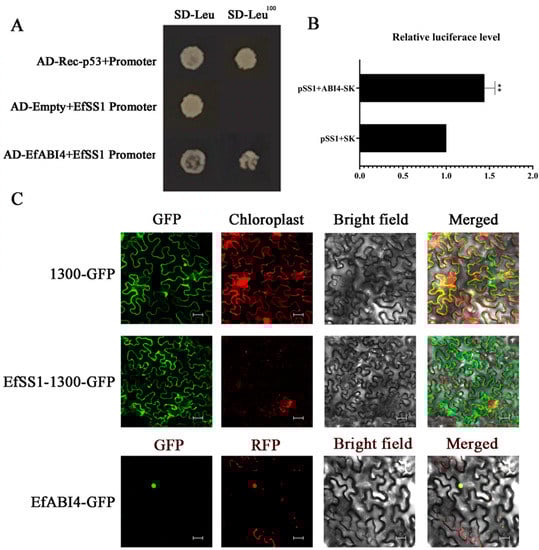 (A): Binding activities of EfABI4 protein with the promoters of EfSS1 detected yeast one-hybrid assays. (B): The relative FLUC/RLUC activities of EfSS1 promoters activated and repressed by EfABI4 in tobacco protoplasts. The relative FLUC/RLUC activity of the negative control was set at 1. ** indicates a significant difference at p < 0.01. (C): Subcellular localization of EfSS1 and EfABI4 (EfSS1 and EfABI4 were inserted into the pCAMBIA1300-sGFP vector). Scale bars, 10 μm.