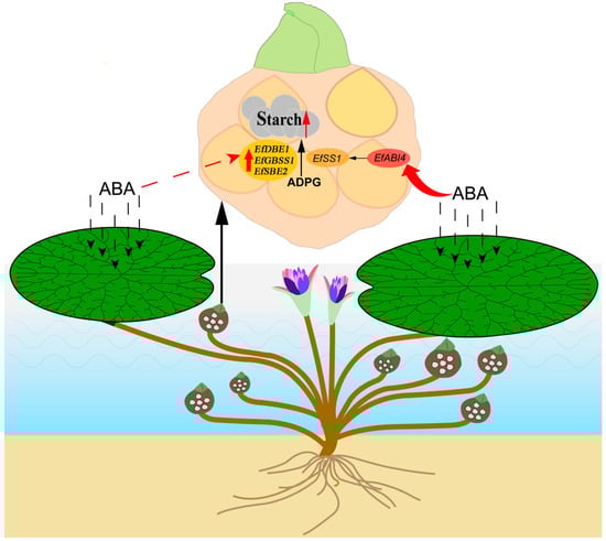ABA (abscisic acid) is one of the five major plant hormones, and plays an important role in regulating plant development []. ABA is closely related to the synthesis and transportation of starch and carbohydrate metabolism in plants. It affects the transport of assimilates by promoting the breakdown, absorption and unloading of sucrose from plant tissues and ultimately promotes starch formation in the sink tissues [,,,,]. During the growth and development of gladiolus and tomato fruits, glucose and fructose contents were positively correlated with endogenous ABA content [,]. In addition, there was a positive correlation between ABA content and starch accumulation rate in seeds of wheat and barley at the grain filling stage []. Furthermore, exogenous ABA treatment can increase the starch content of banana [], lotus [], blueberry and peach [,]. However, the mechanism of ABA regulation of starch synthesis is unclear.