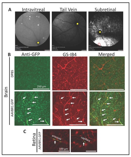 While the greater immune privilege of the subretinal space remains an important consideration for AAV-based ocular therapy [,,], recent studies have confirmed that AAV-mediated photoreceptor and RPE toxicity can be associated with dosage and AAV cis-regulatory sequences [,], underscoring the urgency of minimizing therapeutic dosage while maximizing targeting efficiency. We constructed our AAVBR1.GFP expression plasmid using the universal CMV promoter. However, promoter engineering can be easily used to limit vector expression to specific cell types. The high transduction potency of AAVBR1 following subretinal delivery, combined with cell- or tissue-specific expression, is expected to further enhance the therapeutic applications of AAVBR1, which remains the only AAV capsid capable of targeting retinal (and CNS) microvasculature.