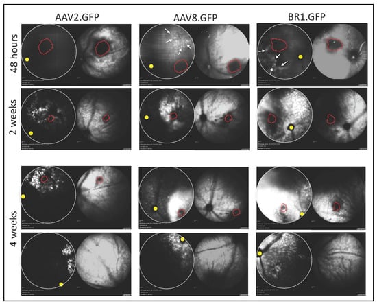 To compare the transduction time course and tropism via subretinal administration of AAVs, 5 × 108 vg of AAVBR1.GFP, AAV2.GFP, or AAV8.GFP was injected subretinally into both eyes. At six weeks post-injection, GFP expression was quantified ex vivo in retinal and RPE flatmounts and confirmed in sections. While the in vivo fundus GFP signal was visible in all AAV-injected eyes by two weeks, AAVBR1 and AAAV8 (but not AAV2) expressed GFP as early as 48 h post-injection. Despite similar early onset of AAVBR1 and AAV8 expression, fundus images showed higher fluorescence from AAVBR1 injection than from AAV2 and AAV8 injections at the two-week timepoint, which clearly extended beyond the injection site to all ocular quadrants at both two and four weeks in AAVBR1-injected eyes. In contrast, the signal from AAV2 and AAV8 injections remained close to the injection site. Figure 2 shows three representative eyes imaged at 48 h, 2 weeks and 4 weeks.