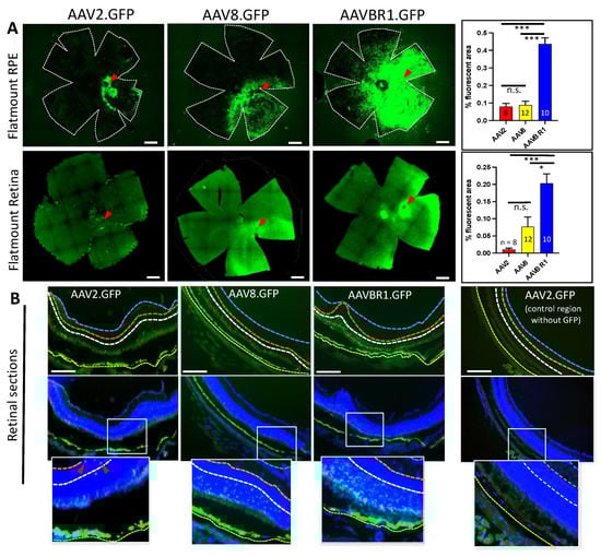 Consistent with in vivo fundus images, ex vivo analysis of retina and RPE at the 6-week endpoint showed that the GFP signal occupied a significantly greater area of AAVBR1-injected RPE and retinal flatmounts than the GFP signal did in either AAV2- or AAV8-injected eyes (Figure 3A). The fluorescent area of AAVBR1-injected eyes was approximately fivefold greater than that of AAV2 and AAV8 in the RPE (AAV2 and AAV8 vs. AAVBR1, both p < 0.001; Kruskal–Wallis test followed by Dunn’s multiple comparisons test). The retinal GFP signal from AAVBR1 injection was 10-fold greater than that of AAV2 and >two-fold greater than that of AAV8 (AAV2 vs. AAVBR1, p < 0.001; AAV8 vs. AAVBR1, p = 0.037; AAV2 vs. AAV8, n.s. Kruskal–Wallis test followed by Dunn’s multiple comparisons test). Images of all AAV.GFP-injected RPE/retinae used in this analysis can be viewed in Supplementary Material A. An examination of retinal cross-sections at the six-week endpoint corroborated the finding that even in fields where the GFP signal was strong in the underlying RPE of all three groups, more GFP-positive cells could be found in the overlying retina of AAVBR1-injected eyes than in either AAV2- or AAV8-injected eyes (Figure 3B). However, within the retina, GFP-positive cells were found almost exclusively in the outer nuclear layer of AAVBR1- and AAV8-injected eyes, whereas sparse fluorescent cells could be seen in the inner nuclear layer (INL) and occasionally the ganglion cell layer (GCL) of AAV2.GFP-injected eyes.
