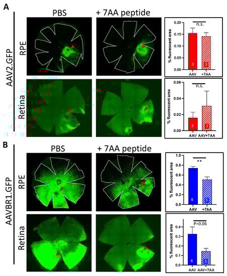 GFP signal from subretinal AAVBR1.GFP injection in eyes is considerably abrogated by co-injection of the 7AA peptide specific to the AAVBR1 capsid. Representative RPE and retinal flatmounts show that subretinal co-injection of 1:500 molar ratio of AAV.GFP:peptide has no effect on (A) AAV2-mediated signal, but significantly reduces signal in (B) AAVBR1-injected RPE at 10 weeks post-injection (p < 0.005 **). Corresponding graphs with % autofluorescence are shown in panels on the right, indicating number of eyes examined for each analysis. Red arrowheads show approximate injection sites. Numbers of eyes examined are indicated in graphs. Error bars represent SEM.