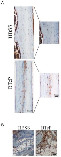 Proliferating cancer lung cells in the femur of BTcP mice. Cytokeratine immunostaining in representative tissue sections from the femur of control mice locally injected with HBSS and mice injected with LLC cells (BTcP mice) is shown in (A). Ki-67 immunostaining is shown in (B).