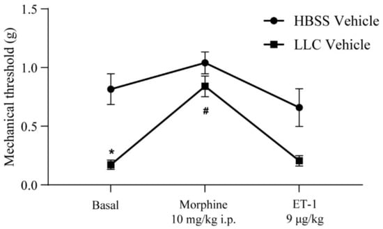 Assessment of mechanical pain thresholds in BTcP and control mice. Paw withdrawal thresholds in BTcP and control (HBSS) mice were recorded 10 min before i.p. injection of morphine (10 mg/kg), 20 min after morphine injection, and 5 min after intrafemoral injection of ET-1 (9 µg/kg). Data are means ± SEMs of 10 mice per group. Two-way ANOVA for repeated measures: HBSS vs. BTcP, F (1, 18) = 12.10; p = 0.0027; treatment, F (1.462, 26.31) = 37.51; p < 0.0001; interaction, F (2, 36) = 6.059; p = 0.0054. Sidak’s post hoc test p < 0.05 vs. the corresponding value of the HBSS group (*) or vs. basal and ET-1 value of the same group (#).
