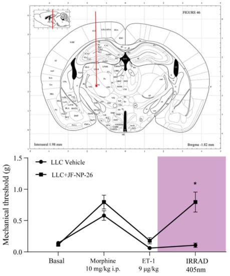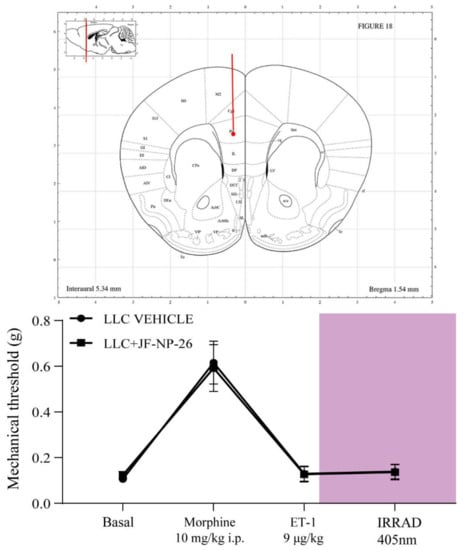 To examine the efficacy of light-induced activation of JF-NP-26 in the ET-1 BTcP model, different groups of mice were bilaterally implanted with optic fibers in the ventral basal thalamus or in the prelimbic cortex, two brain regions in which mGlu5 receptors are involved in pain transmission and nociceptive sensibilization [,]. Light was delivered at a wavelength of 405 nm, which has been identified as the optimal VS wavelength causing photolysis of JF-NP-26, into the active mGlu5 receptor NAM, raseglurant []. Light delivery into the thalamus 5 min following ET-1, caused fast analgesia in mice that had been treated systemically with JF-NP-26 (10 mg/kg, i.p., injected at the same time as morphine) (Figure 3). Intrathalamic irradiation did not change pain thresholds in mice that were injected systemically with vehicle instead of JF-NP-26 (Figure 3).