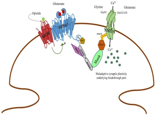 An attractive hypothesis is that thalamic mGlu5 receptors mediate the expression of a maladaptive form of synaptic plasticity that is induced by chronic activation of opioid receptors within the context of cancer pain. Interestingly, recent findings indicate that MOR opioid receptors and mGlu5 receptors form functional heterodimers that can be targeted by analgesic drugs in bone cancer pain []. NMDA receptors are involved in the pathophysiology of breakthrough pain which develops during treatment with opioids [], and mGlu5 receptors are physically and functionally linked to NMDA receptors []. Opioid, mGlu5, and NMDA receptors may form a mènage-a-trois, which underlies the development of breakthrough pain (Figure 5); selective pharmacological blockade of mGlu5 receptors in the thalamus may disrupt the link among these receptors, producing fast and substantial analgesia.