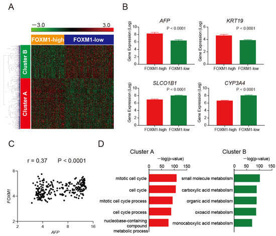 We performed a class comparison analysis with t-tests and permutation tests (p < 0.001) of the class labels (FOXM1-high and -low) using BRB-ArrayTools (version 4.3.2) and identified 2119 genes differentially expressed between the classes (1275 genes upregulated and 844 downregulated in FOXM1-high HCC compared with FOXM1-low HCC) (Figure 2A). Among them, typical liver cancer stem cell markers such as AFP and keratin 19 (KRT19) were upregulated in FOXM1-high HCC, whereas typical mature hepatocyte markers such as solute carrier organic anion transporter family member 1B1 (SLCO1B1) and cytochrome P450 3A4 (CYP3A4) were downregulated (Figure 2B). A weak positive correlation was observed between FOXM1 and AFP signal intensities in 238 microarray samples (Figure 2C, r = 0.37, p < 0.0001, Spearman’s rank correlation coefficient). We performed pathway analysis using these gene sets by MetaCore software (http://portal.genego.com (accessed on 26 May 2020)). Noticeably, the pathways activated in FOXM1-high HCC were strongly associated with mitotic cell cycle processes (Cluster A), whereas those inactivated were strongly associated with mature hepatocyte metabolism (Cluster B) (Figure 2D).