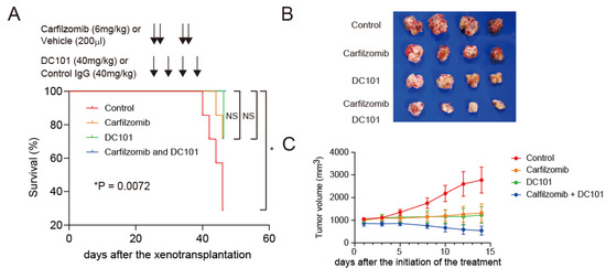 The study protocol was approved by the Kanazawa University Animal Care and Use Committee, and all procedures were performed in accordance with the guidelines and regulations of Kanazawa University. Six-week-old male non-obese diabetic (NOD)/severe combined immunodeficiency (SCID) mice were purchased from Charles River Laboratories, Inc. (Wilmington, MA, USA). Huh7 cells (1.0 × 106 cells) were suspended in 200 µL Dulbecco’s modified Eagle’s medium and Matrigel (1:1) and subcutaneously injected into the flank region of the mice. The mice were randomly divided into four groups and treatment was started when tumor volume reached approximately 1000 mm3. The control vehicle (200 μL/day) or carfilzomib (6 mg/kg/day) was injected intraperitoneally on days 1, 2, 8, and 9. Control IgG (40 mg/kg) or anti-mouse VEGFR2 monoclonal antibodies (DC101, 40 mg/kg) were injected intraperitoneally on days 1, 4, 8, and 11. For survival analysis, the survival status of the mice (n = 7 in each group) were recorded every 2–3 days, and the mice were classified as “dead” and euthanized when tumor volume exceeded approximately 4000 mm3. For anti-tumor response analysis, the size of subcutaneous tumors (n = 4 in each group) was recorded every 2–3 days during treatment for 2 weeks. The mice were euthanized on day 14, and tumor volume and weight were measured. Subcutaneous tumors were excised and subsequently fixed in formalin and used for immunohistochemistry.